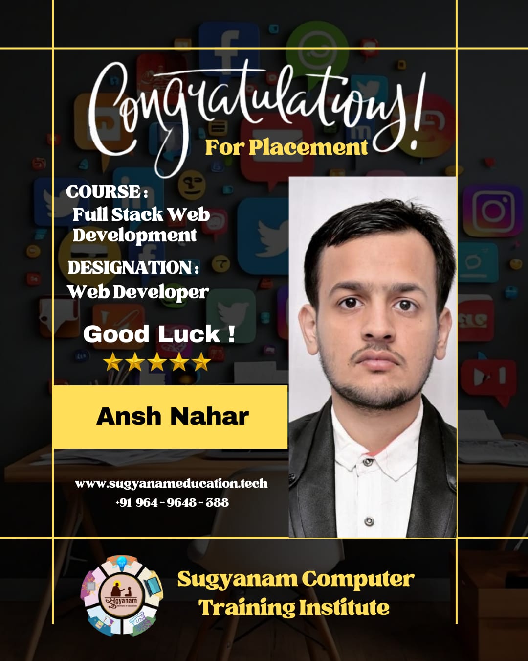 At Sugyanam Institute of Education, we ensure that career opportunities extend beyond the campus through our Off-Campus Placement Program. Students are encouraged and guided to participate in placement drives conducted by companies at external locations, giving them exposure to a broader job market.